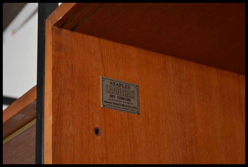 Robert Heal - Ladderax - A mid 20th Century vintage retro teak wood 3 bay wall system comprising of a sliding door shelved storage cupboard, 3 straight drawer unit and a fall front bureau and many shelves with black metal uprights and brass rails.