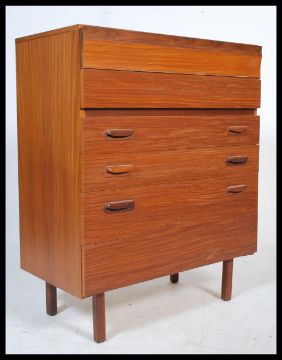 A vintage retro 20th Century teak chest of drawers, six graduating drawers raised on short tapering supports. Measures: 107cm high x 87cm wide x 46cm deep.
