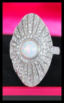 A sterling silver art deco style opal and marcasite dress ring of shield form having a central opal.