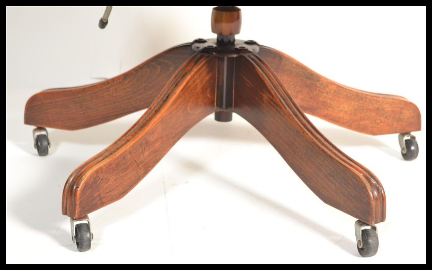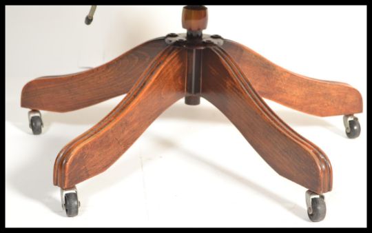 An antique style 20th century Ox blood buttoned back leather Captains style swivel desk office  chair raised on a wheeled five point base with mahogany spindle gallery frame and leather upholstery. Measures: 85cm high x 63cm wide x 56cm deep.