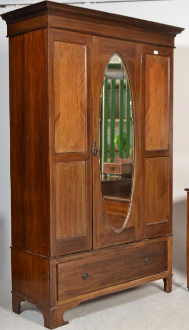 An Edwardian mahogany inlaid dressing table chest of drawers together with a matching Edwardian inlaid single wardrobe with plinth drawer and mirror door
