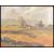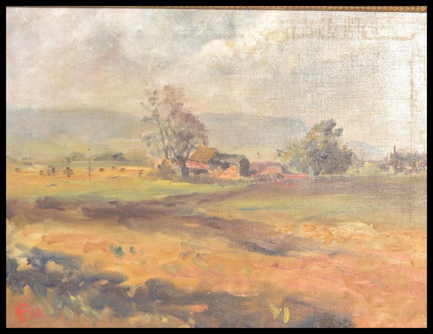 A mid 20th century oil on canvas painting depicting a rural landscape scene with buildings and trees having mountains to background. Artist monogram to left lower corner. Set to and ornate gilt frame.