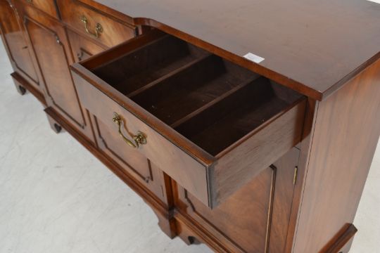 A good flame mahogany large breakfront sideboard being raised on bracket feet with a series of short drawers over cupboards beneath. Brass swing handles to drawers, with keys