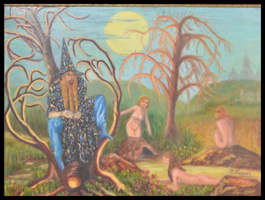 A vintage 20th century unusual erotic oil on canvas painting entitled the Wizards Court featuring a seated wizard with nude maidens. Signed by artist Betty Harper.