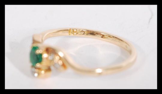 An 18ct yellow gold emerald and diamond ring having a central faceted emerald stone with diamond leaves. Size M.5 weighs 1.9 grams.