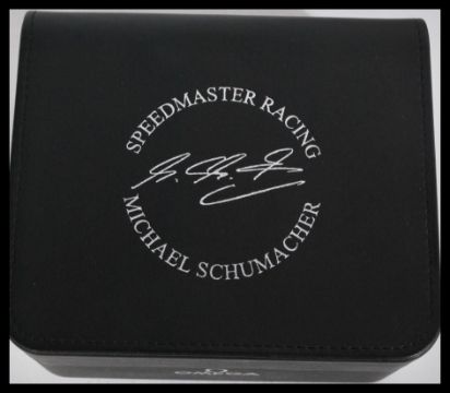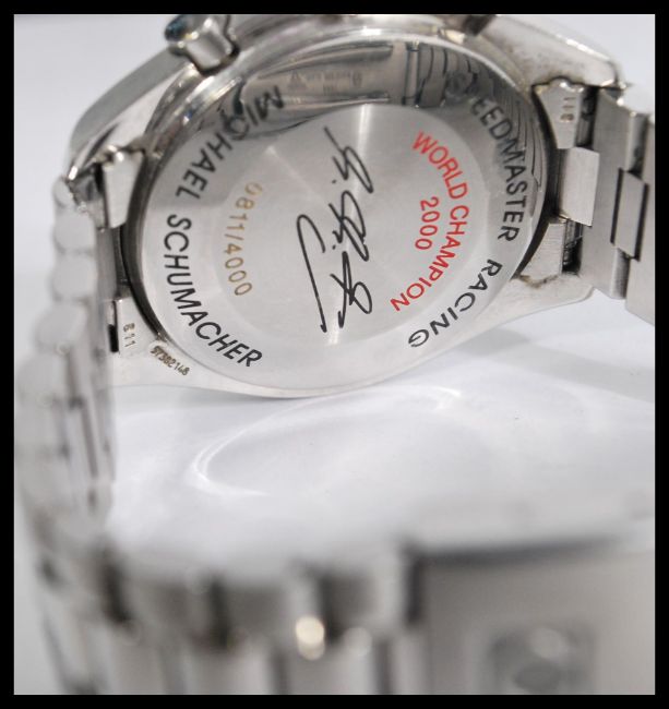 An Omega Speedmaster Racing Michael Schumacher signature edition automatic wrist watch complete in original box and outer box with certificates warranty card and paperwork. World Champion 2000 edition 0811/4000. The silvered checkered dial having triple subsidiary dials with faceted hands and white luminous baton numerals. On stainless steel Omega watch bracelet.