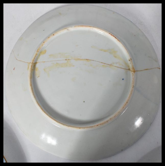 A group of early 20th century Royal Worcester cabinet plates in the fide et fiducia pattern with gilt details and central medallion along with a pair of Chinese Dragon and Bird by Mintons / Minton with Victorian date lozenge and a hand painted Japanese Imari plate (AF). Largest measures 23 cm diameter.