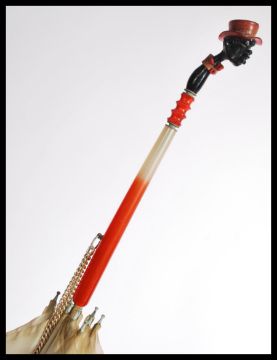 An early 20th century parasol having an early plastic handle in the form of a negro man with red hat. Bail loop to side with gilt metal chain. Measures 87 cm long.
