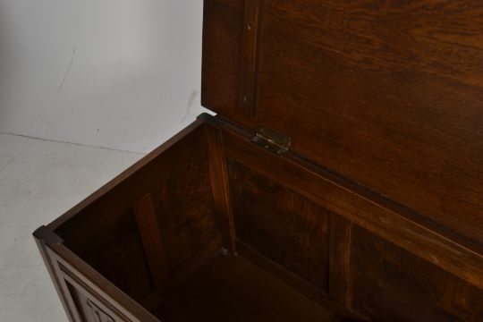 A 20th century Jacobean revival oak coffer chest with hinged top over fielded panel sides with carved details to the front panels