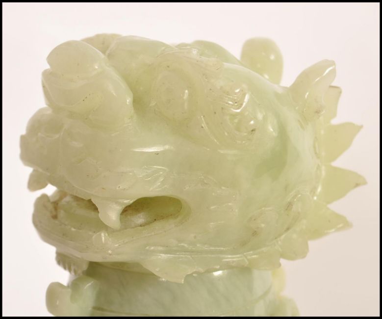 An unusual large Chinese Jade fu dog - temple dog inkwell pot sculpture. The large carved model with shaggy mane and brest in seated position, the head lifting off to reveal a well. Measures 18.5cms tall
