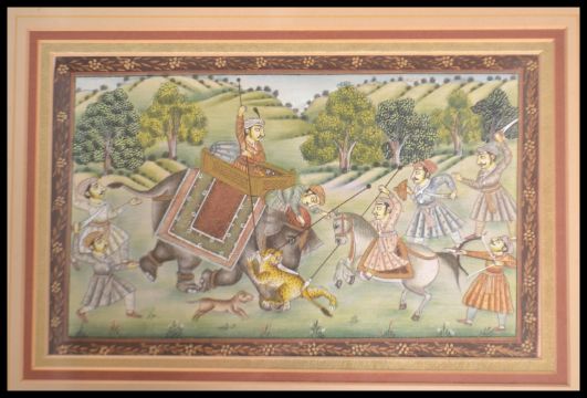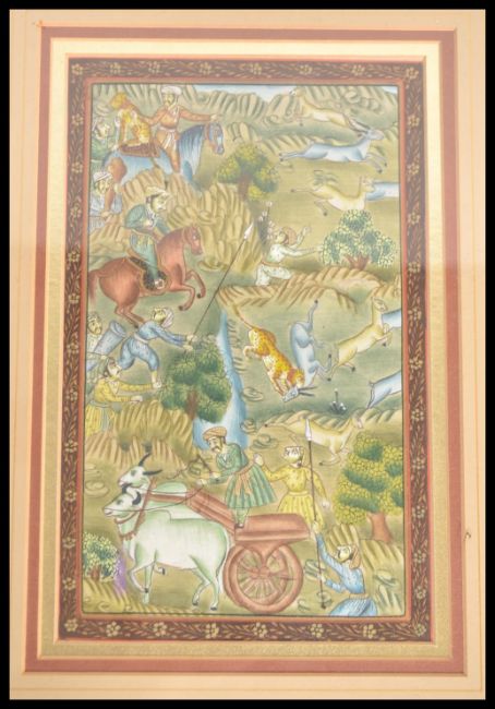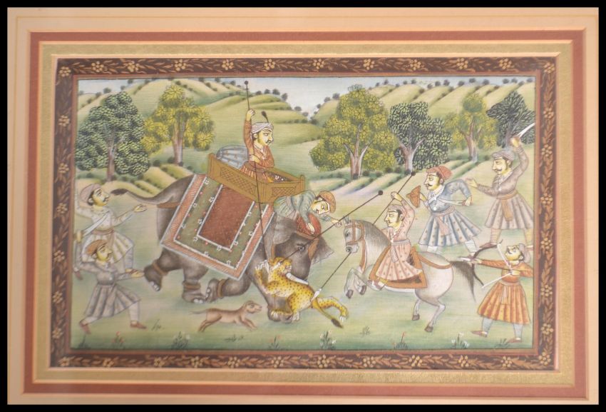 A collection of five Anglo Indian watercolour paintings ( most on silk ) of Moguls hunting large cats from atop of elephants.