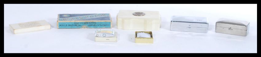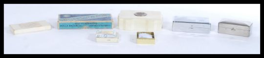 A group of vintage lighters and razors to include Everready Eclipse Rolls , Penguin and Ronson lighter. Also a Kleeneze 1953 box and a Red Cross medal.