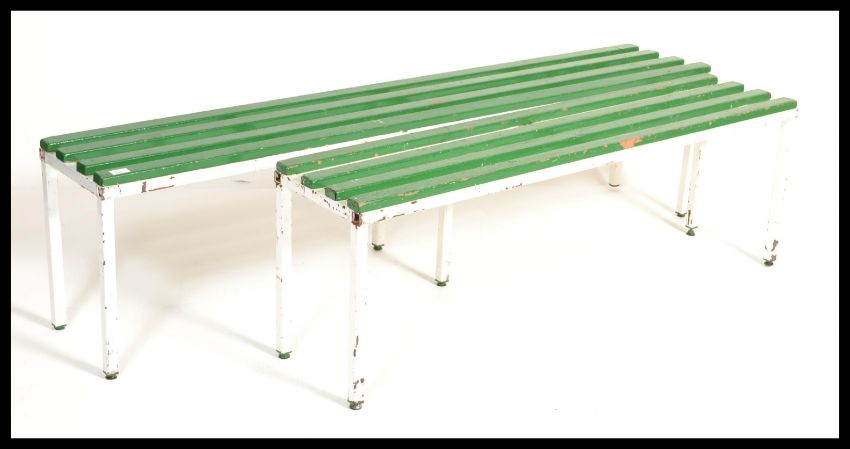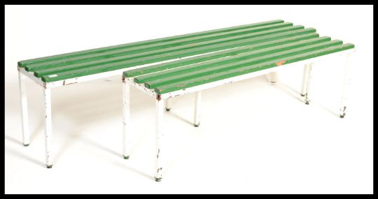 A pair of vintage 20th century Lilo / Tennis sports four seater benches having a white metal frame with green metal seats. Measures: