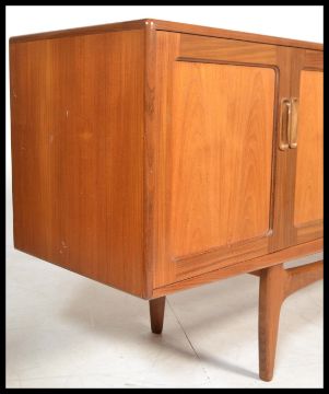 A good retro 1970's long and low G plan Fresco teak sideboard enclosed by moulded panelled door cupboards and four central long drawers all raised on tapered column supports. 79cm high x 212cm wide x 46cm deep