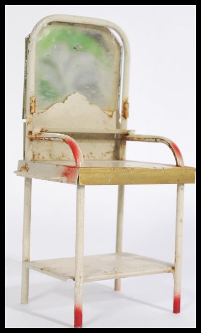 A group of three vintage early 20th century metal dolls house furniture to include a plate rack backed oven and pans , bathtub on stand etc.Please see images.