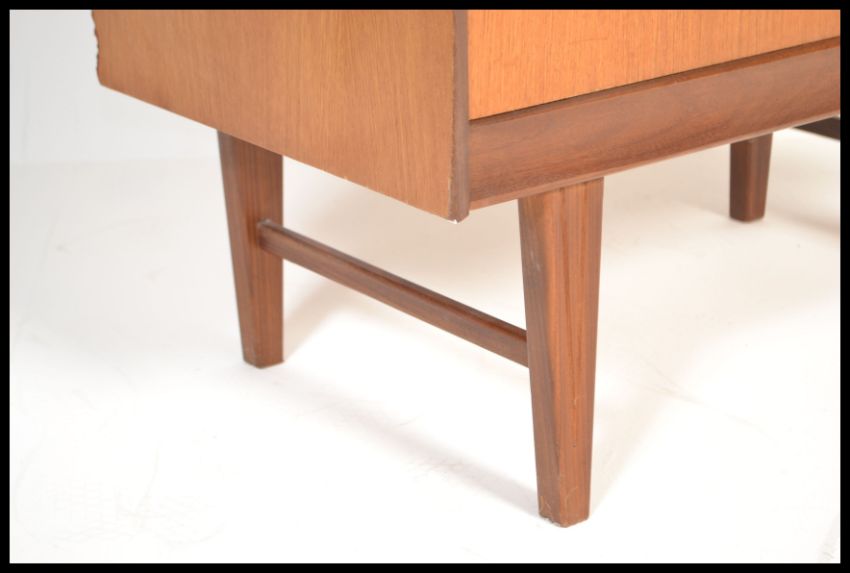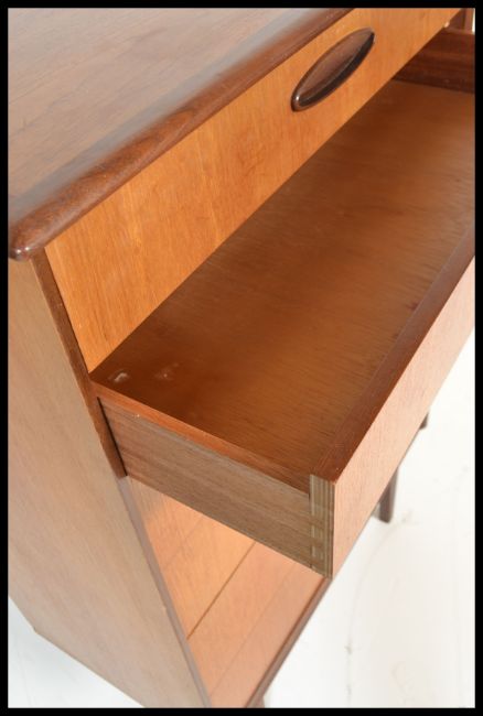 A vintage mid century Danish style upright pedestal chest of drawers with inset detail handles to each drawer and being raised on tapered legs.