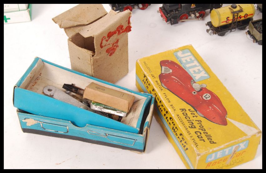 An assorted collection Trix Twin Railway ( TTR ) 00 Gauge scale model railway trainset locomotive and rolling stock / carriages to include 2x BR locos and several carriages and spares and accessories to include a Jetex empty box.