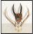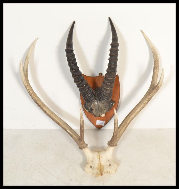 A pair of vintage 20th century stag antlers having 6 points together with an armorial shield plaque mounted with oryx horns