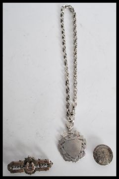 A silver hallmarked armorial medal with plain cartouche together with albert chain on link form and lobster clasp. Birmingham hallmarked, chan 36cms long. Together with a silver and gold sweetheart brooch, Birmingham hallmarked and a silver hallmarked button, Chester. Total weight 41.8g