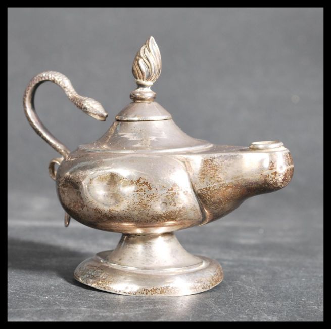 An early 20th century Edwardian hallmarked silver table lighter in the form of an oil lamp / Aladdin 's genie lamp  with handle modelled as a snake and finial modelled as a flame, Mappin & Webb, Birmingham 1906.