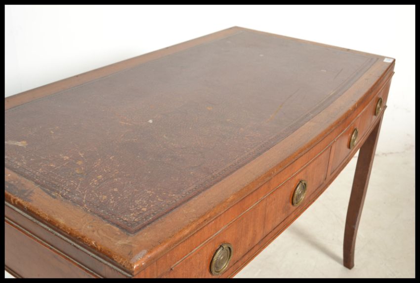 An Edwardian mahogany bow front writing table desk being raised on square tapering legs with fitted frieze drawers under brown tooled leather desk top above