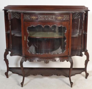 An Edwardian mahogany aesthetic movement display cabinet chiffonier raised on cabriole legs with rococo carved wide body a central  glazed display