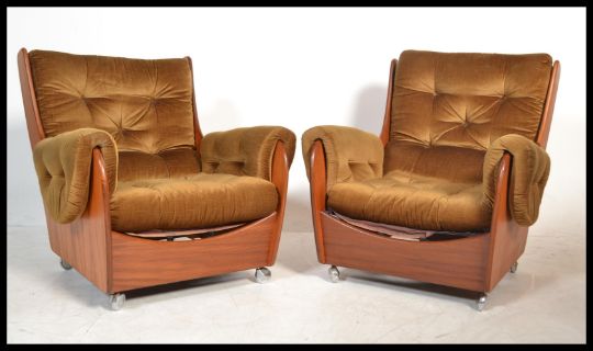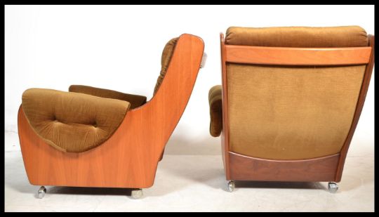 E Gomme for G-Plan - a vintage retro 20th century teak three piece suite consisting of three large arm chairs with matching sofa settee. The shaped supports having Pirelli straps carriers with deep back rests and cushions. Measures: 86cm high x 156cm wide x 92cm deep sofa