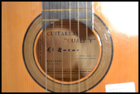 A group of three vintage acoustic six string guitars having shaped hollow bodies with paper labels to interior.