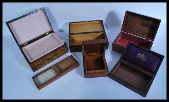A collection of antique wooden work boxes dating from the 19th century to include tunbridge ware  , cribbage box , walnut box , a box with a CWS Radcliffe plaque , mahogany and mother of pearl writing slope. Largest measures 11.5 cm high, 25 cm wide and 17.5 cm deep.