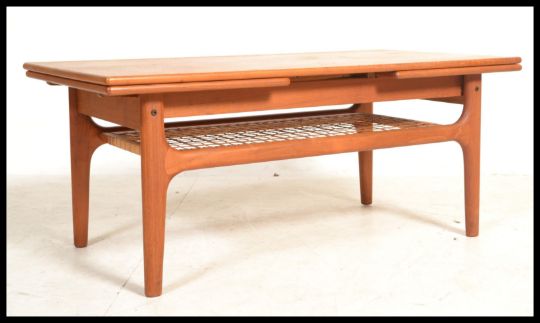 A retro 20th Century Danish inspired teak draw-leaf coffee table, with a latticed undertier raised on shaped supports. Measures: 44cm high x 105cm wide x 54cm deep.