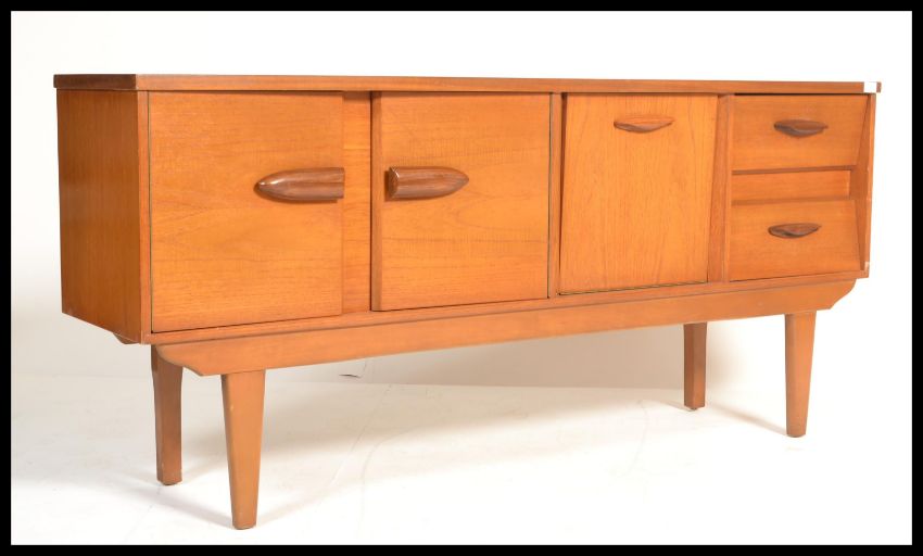 A vintage teak wood sideboard with 2 doors to left, drop down door in middle and 2 drawers to right. Measures: 76cm high x 167cm wide x 40cm deep.