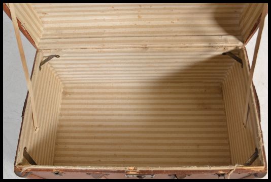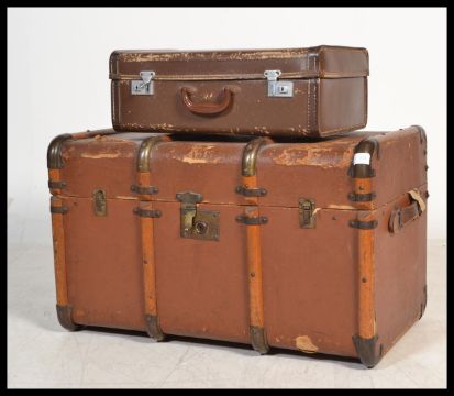 A vintage early 20th century canvas and wooden bound steamer trunk along with a vintage leather suitcase. Please see images.