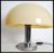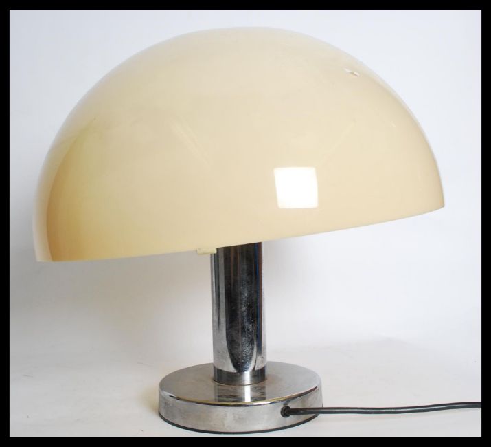A vintage 1970's retro 20th century Cosmo Designs chrome table lamp raised on a circular base with plastic mushroom shade. Please see images.