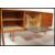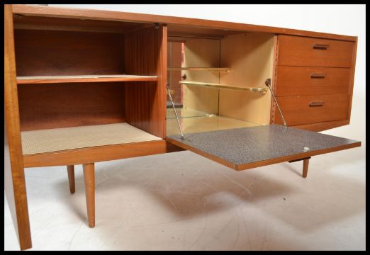 A vintage retro 20th century Danish influence sideboard raised on tapered supports having central lift down cupboard flanked by a standard cupboard and a bank of three drawers. Measures 79cms high by 184cms wide by 46cms deep.