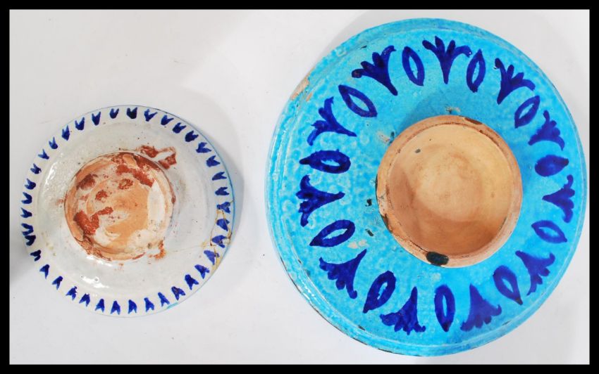 A collection of four Persian / Islamic glazed pottery items to include a large dish on blue ground with a central floral motif, another smaller dish and ewers / water vessels decorated with similar motifs. Measures 29 cm high and 32 cm diameter.