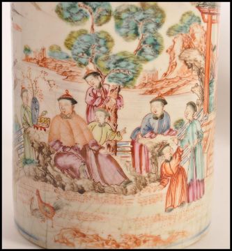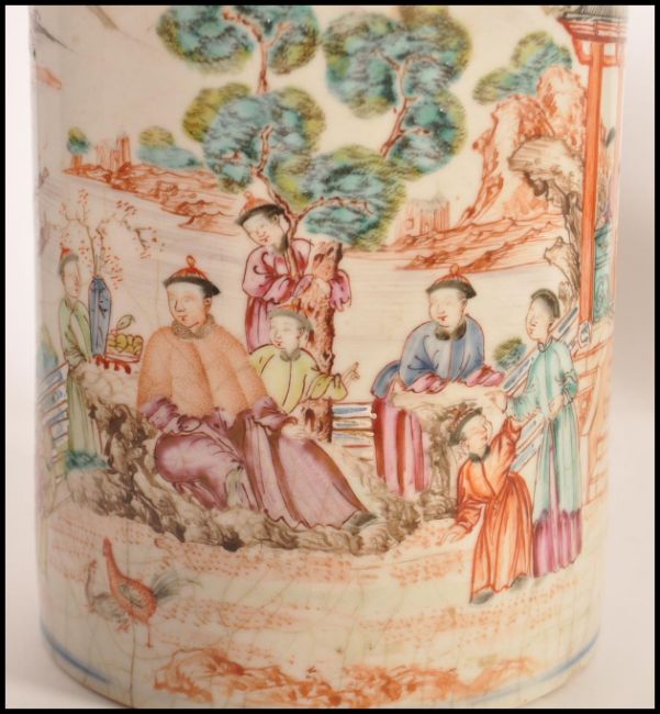 A 19th century Chinese export porcelain mug being decorated with scenes of family and pagoda buildings having banboo shaped handle ( af ) Measures 13.5cms high