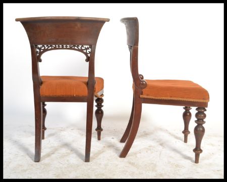 A Set of three William IV Mahogany Dining Chairs, 2nd quarter 19th century,  with curved top rails and shaped uprights above later upholstered seats, raised on turned  tapering forelegs