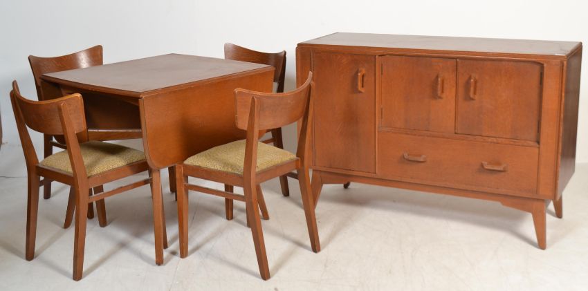 A mid century Ernest Gomme, circa 1950's golden oak dining room suite comprising sideboard, dining room table and 4 chairs. The chairs with drop in seats of original fabric.