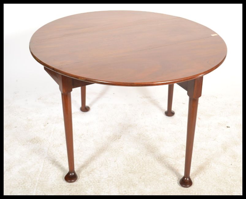 A 19th century Georgian mahogany drop leaf dining table being raised on shaped legs wih pad feet. The oval half moon drop leaves raised on gate leg action Measures 70cms high by 106cms wide by 41cms deep.