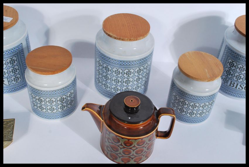 A collection of Hornsea ceramic kitchen storage jars in the Tapestry pattern having wooden lids. Various sizes and some with notation reading Biscuits Flour etc. Please see images. Highest measures 20 cm.