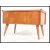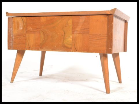 A 1950's Post war Art Deco style walnut sewing box with contents. Raised on turned legs with a parquetry top opening to reveal sewing contents. Measures: 41cm high x 66cm wide x 38cm deep.