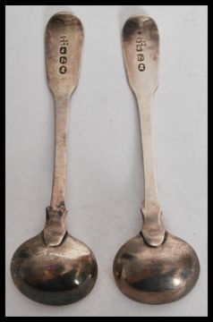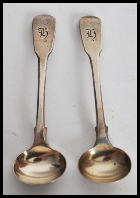 A pair of early 19th century Georgian hallmarked silver chocolate ladles in the fiddle pattern having monogrammed terminals. Hallmarked for London 1817 makers  William Eley & William Fearn. Weighs 28 grams.