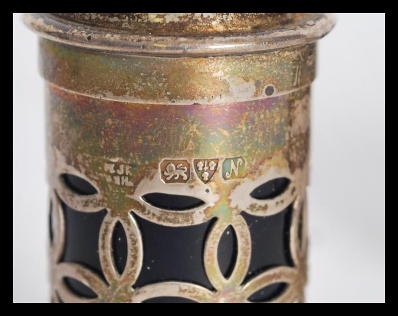 A group of three silver hallmarked condiments each having blue glass liners to include a salt , pepperette and lidded mustard pot with hallmarked silver spoon.