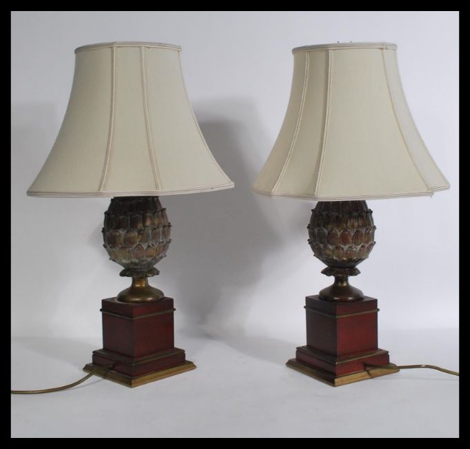 A good pair of late 20th century pineapple table lamps. Each on squared red socle plinth bases with carved pineapple columns having shades atop