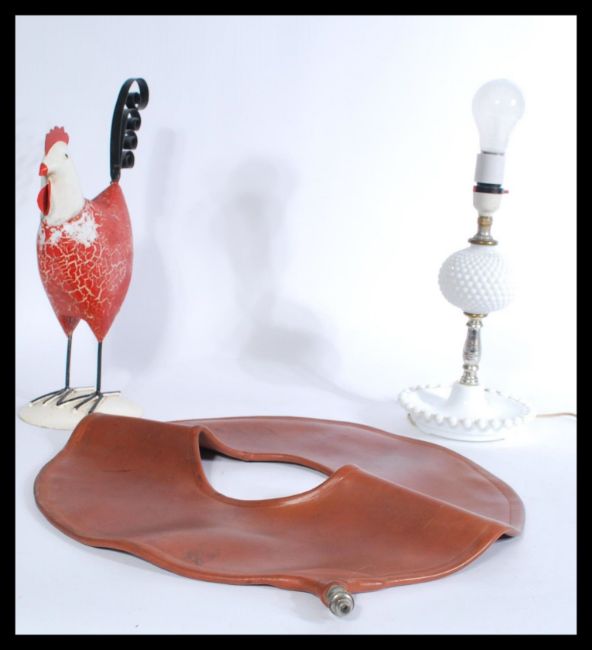 A collection of items to include milk glass table lamp, metal work chicken and a vintage rubber ring please refer to images. Highest measures 40 cm.