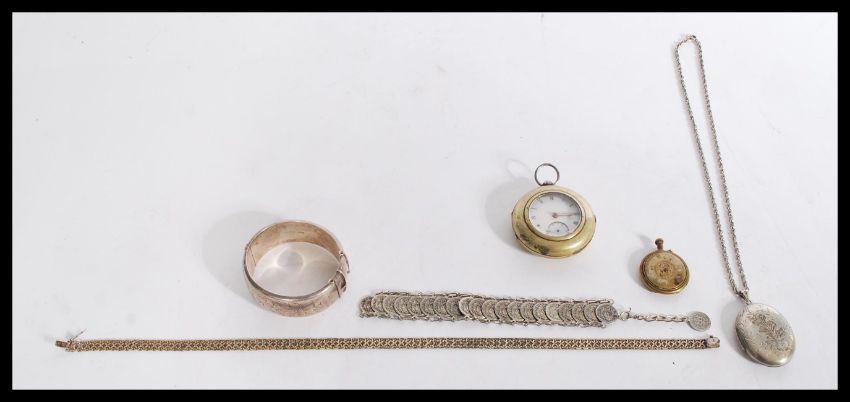 A good collection of vintage and antique pieces to include a Victorian silver hallmarked cased Fusee pocket watch, a silver hallmarked locker on silver chain, silver necklace marked 925, silver hallmarked chase decorated hinged bangle etc. Large outer case of the pocket watch measures 6 cm diameter.