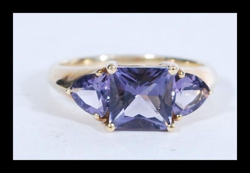 A hallmarked 9ct gold purple stone trilogy ring. Hallmarked Birmingham. Weight 3g. Size N.