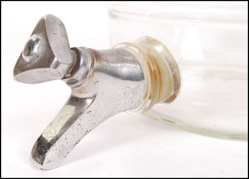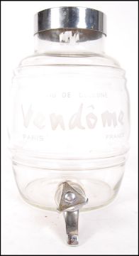 A mid 20th Century circa 1950's vintage chemists apothecary shop advertising point of sale large perfume dispensary, made from toughened glass of barrel form with a chromed lid steel tap to the base. Notation to front in bold lettering reading ' Eau De Cologne Vendome Paris France ' . Measures 29cm tall.
