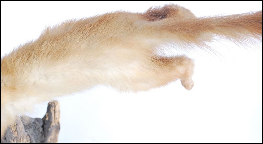 Taxidermy Interest - An early 20th Century antique vintage stuffed stoat positioned as if jumping, holding an egg in it's mouth together. Measures 50cm tall.