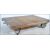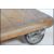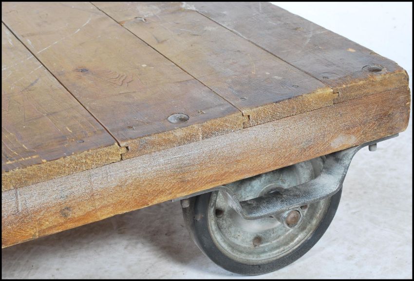 A vintage industrial 20th century trolley having pressed metal and rubber wheels with formed steel supports and wooden top. Ideal for coffee table conversion. Measures 24cm x 120cm x 80cm.